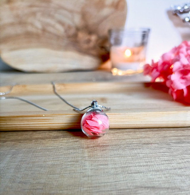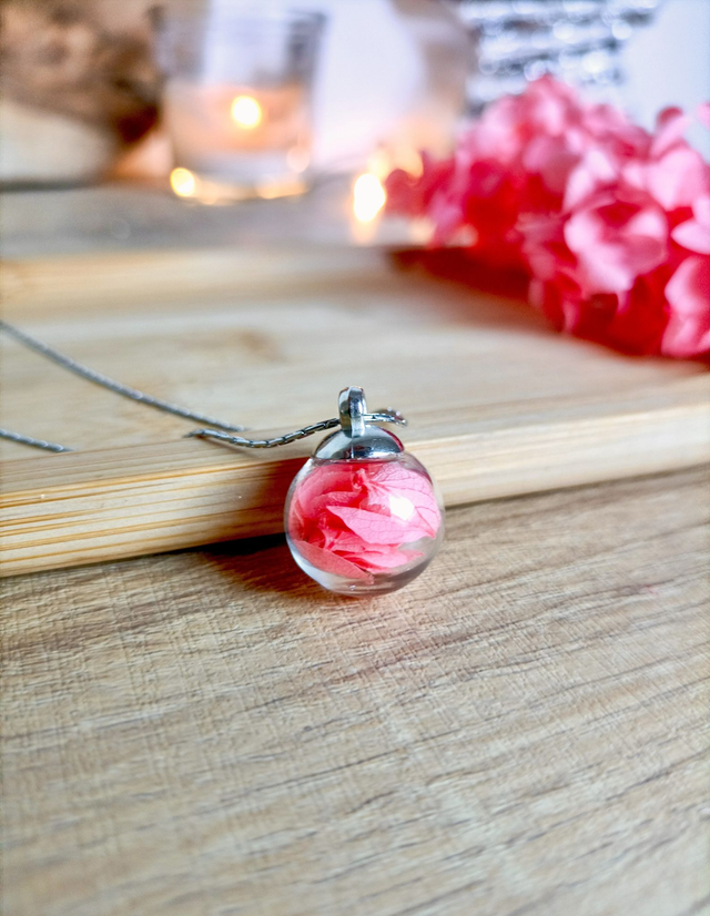 - Composition : Pendentif en verre soufflé, hortensia stabilisé rose - Chaîne en acier inoxydable argent 316L