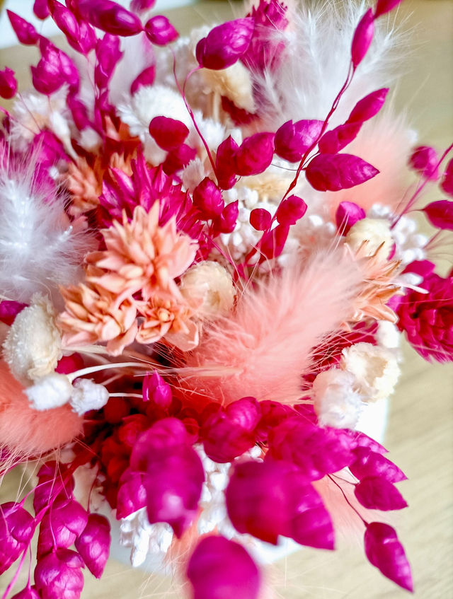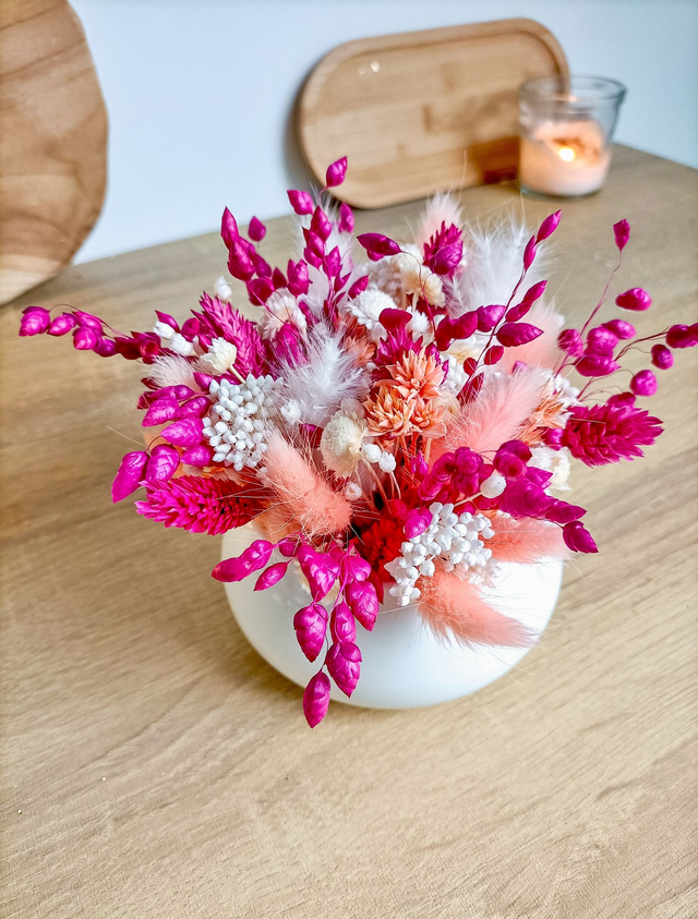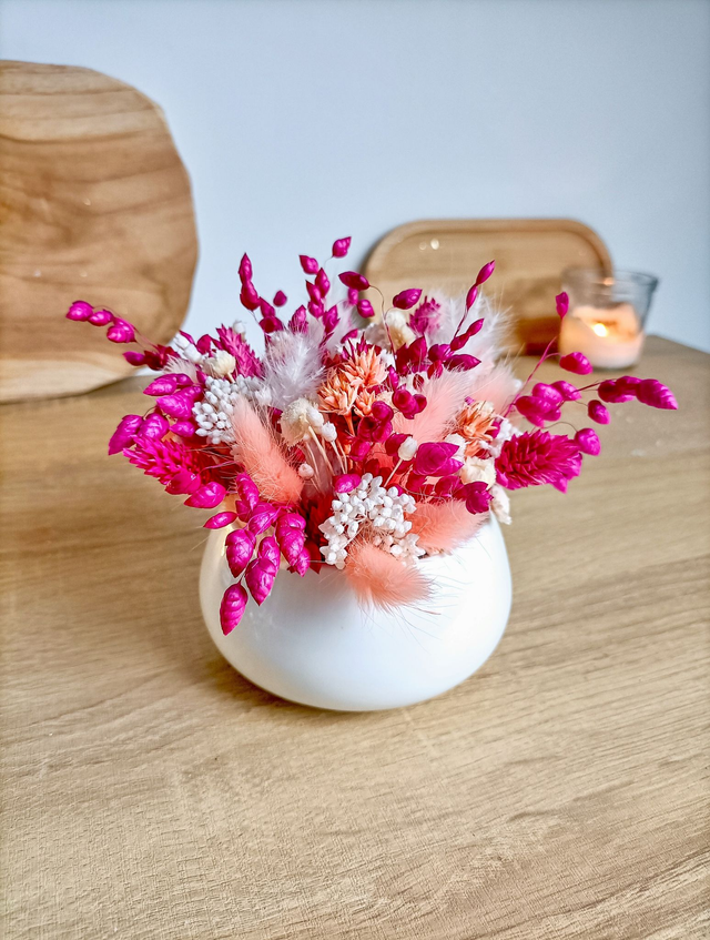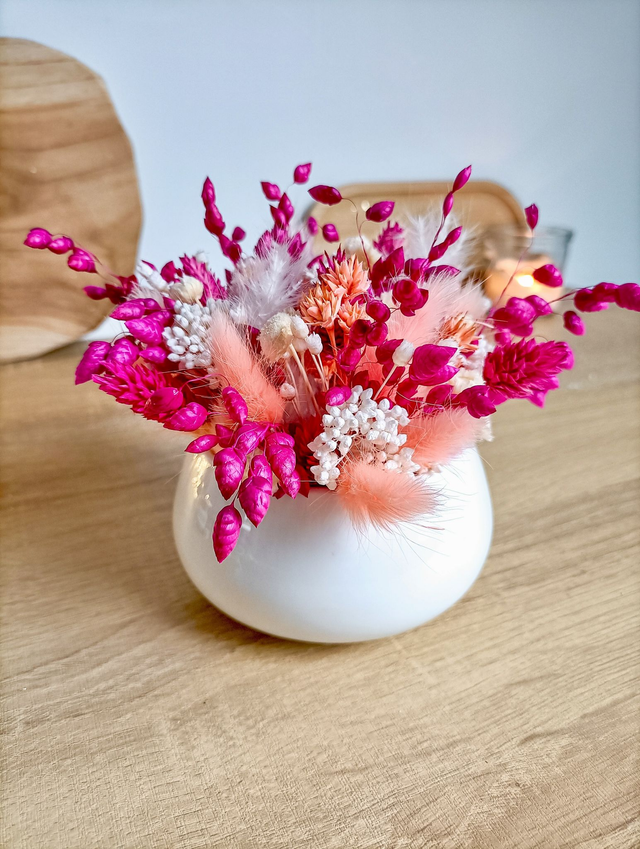 Réalisée dans un élégant contenant en porcelaine blanche, elle marie des fleurs séchée aux couleurs à la fois vives et tendres de magenta, pêche et blanc, pour un résultat craquant.
