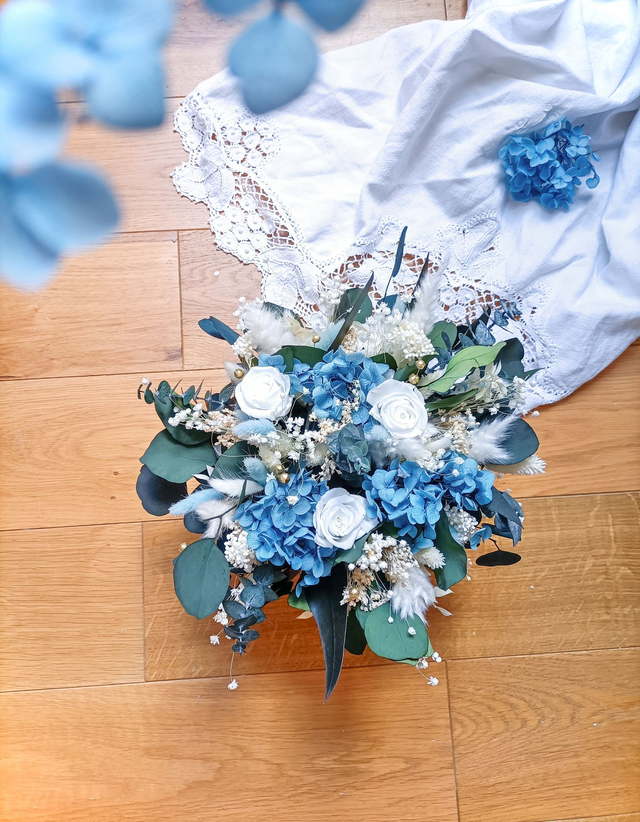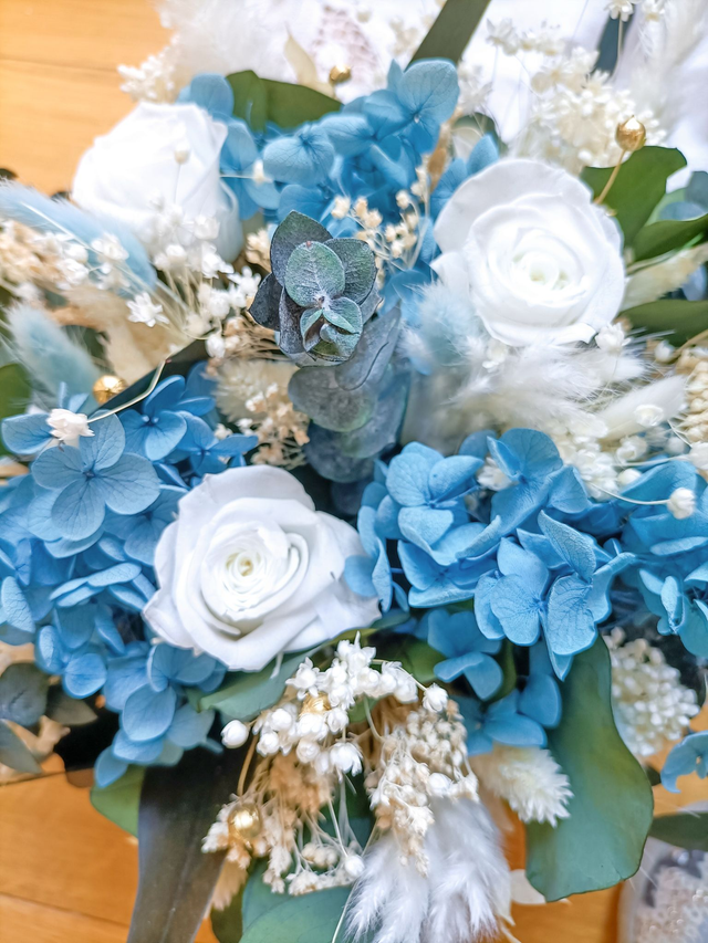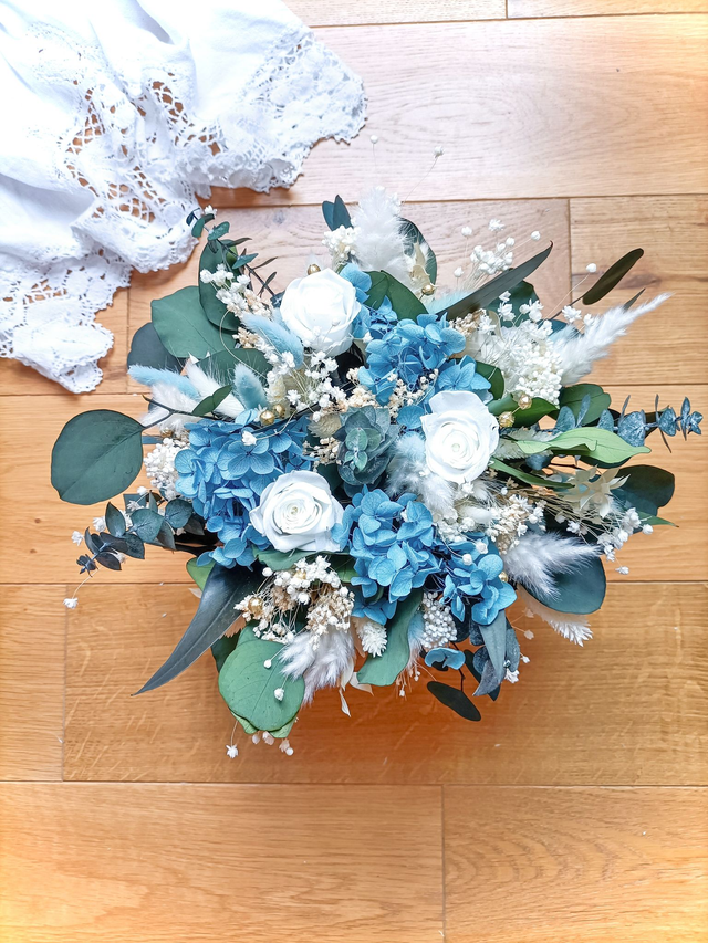 Un mélange harmonieux de fleurs bleues et blanches, agrémenté de feuillage d’eucalyptus, qui crée un équilibre parfait entre fraîcheur et raffinement.