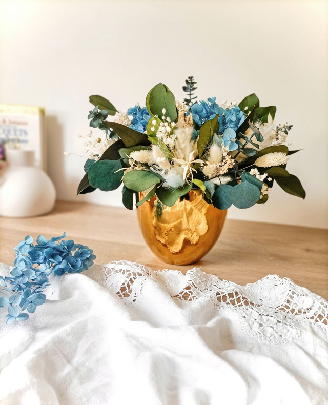 • Composition: Cache-pot doré- Fleurs stabilisées: Roses-hortensia-pampa-lin-eucalyptus-jazilda-lagurus-phalaris