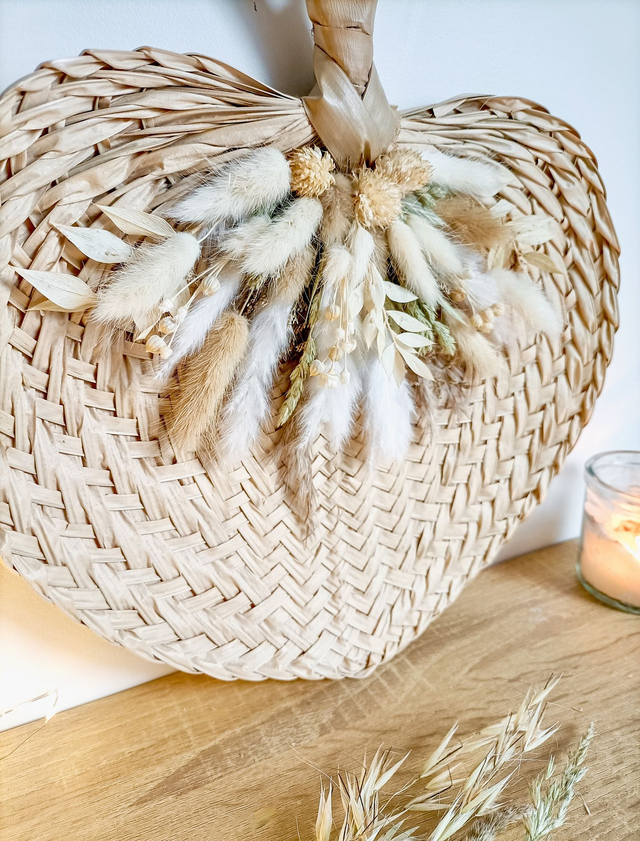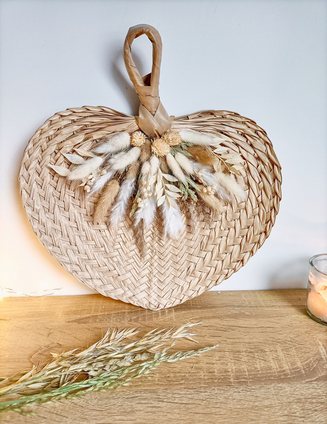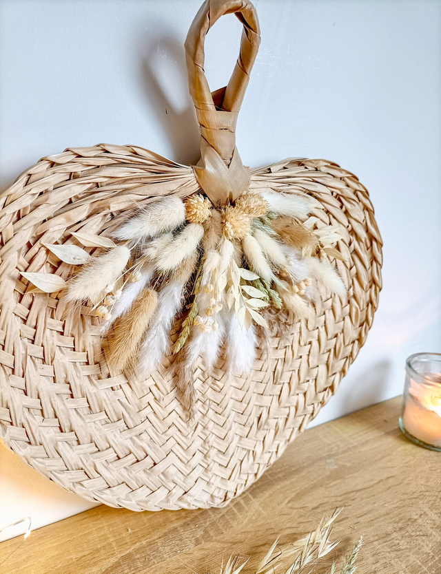 Bohème attire immédiatement le regard : une feuille de palme tressée, aux courbes naturelles, relevée d’un ensemble délicat de fleurs séchées en blanc, crème et vert sauge.