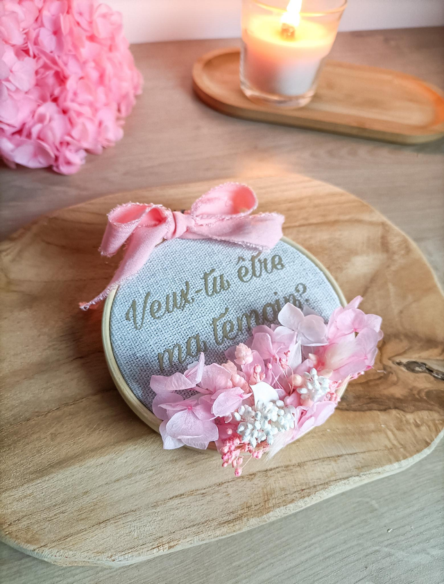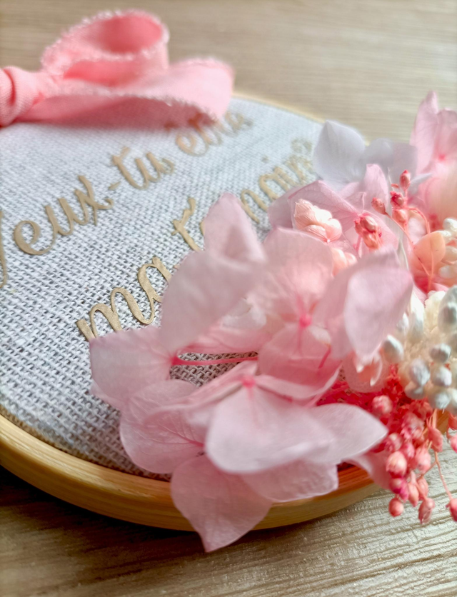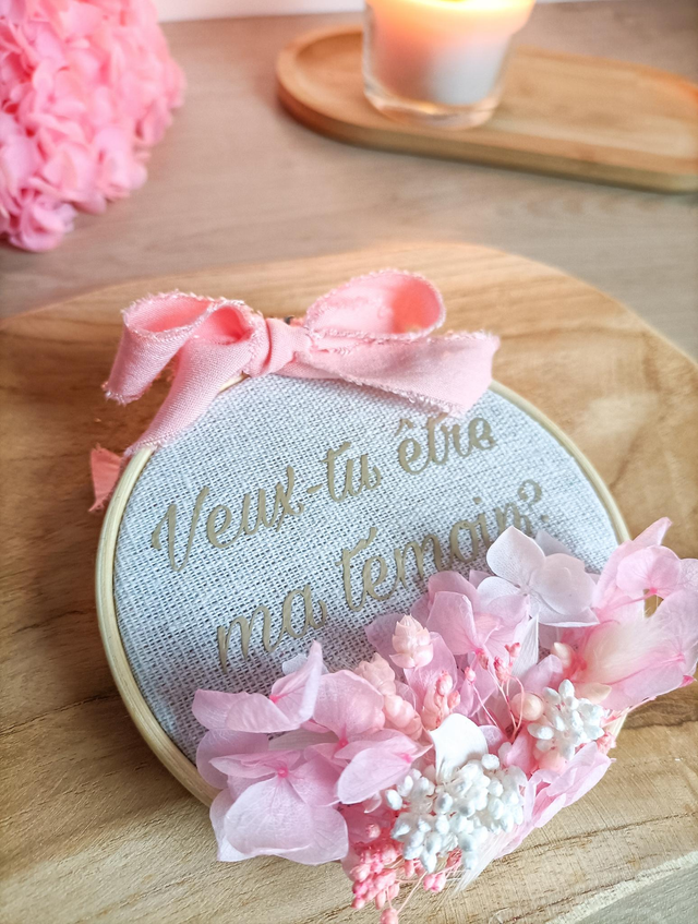 - Composition: Fleurs stabilisées - Cercle à broder en bois de 10cm - Tissu en lin beige. Nœud