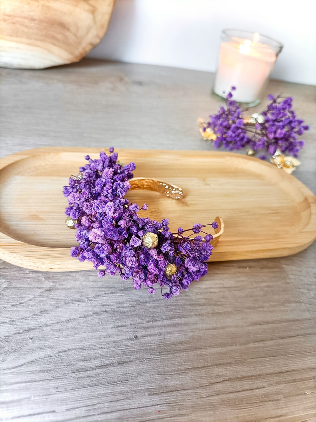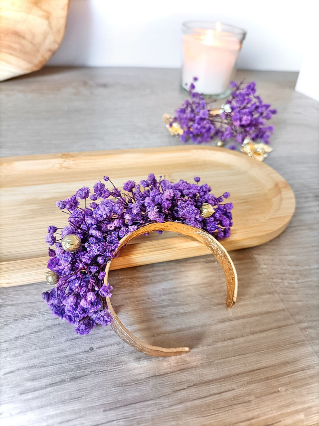 Apportez une note féerique et raffinée à votre poignet avec ce bracelet orné de fleurs violettes et de touches de doré. Monté sur un jonc en métal doré, il se porte facilement seul ou en association avec d’autres pièces de la collection pour un effet harmonieux et lumineux.