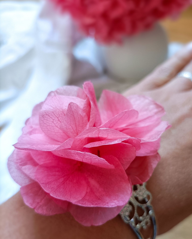 - Composition: Fleurs d'hortensia roses. Bracelet en acier inoxydable argenté légèrement ajustable. Il épouse le poignet tout en restant résistant à l’usure.