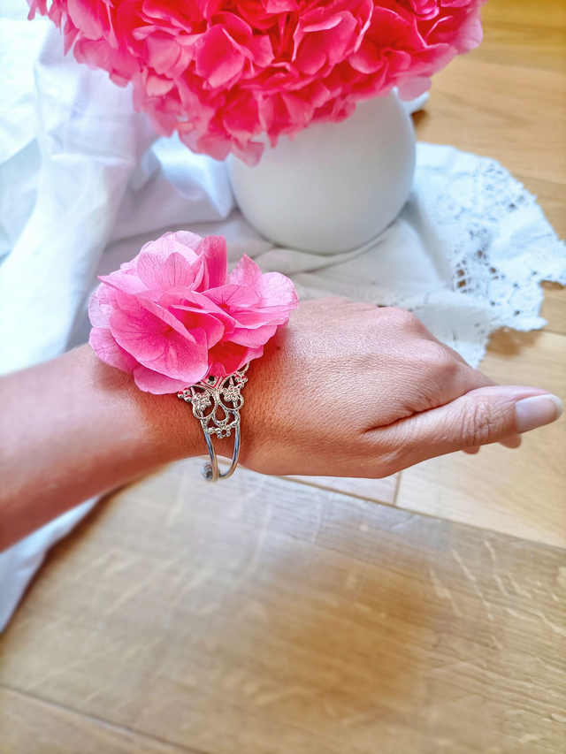 Le bracelet manchette Romance d'Antan est orné de pétales d’hortensia rose, pour une touche florale pleine de douceur.