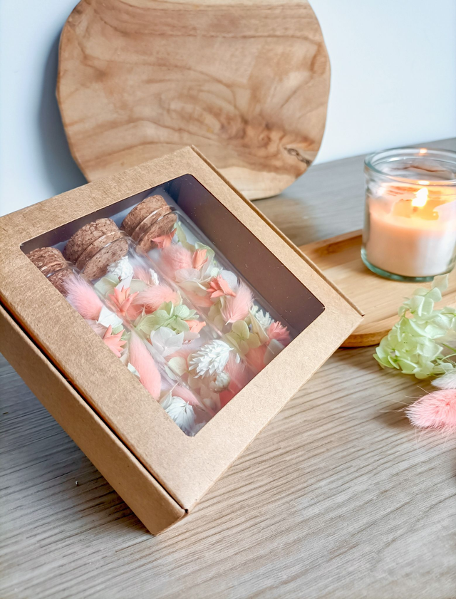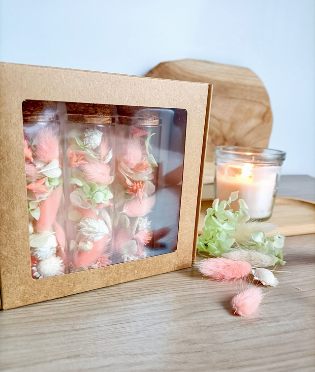 2. Composition: 3 fioles en verre - bouchons en liège. Hortensia, phalaris, lagurus- Coffret en kraft - Papier de soie.