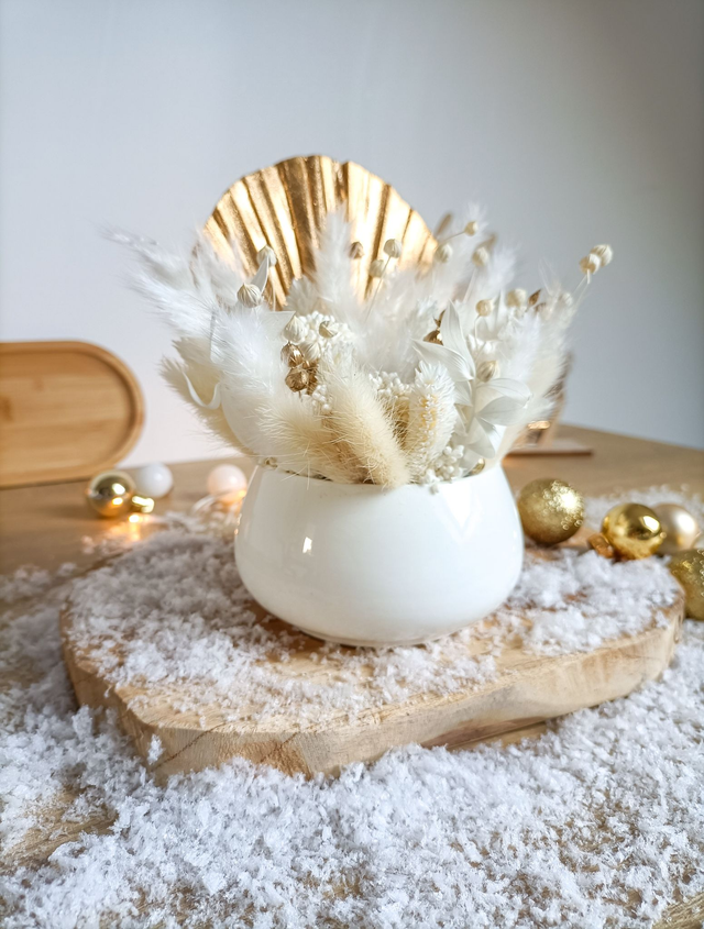 Réalisée dans un élégant contenant en porcelaine blanche, elle marie des fleurs séchées blanches à une feuille de palme dorée, pour un contraste doux et précieux. Elle sera parfaite pour offrir lors des fêtes, sublimer une étagère, ou apporter une petite note givrée à un coin de votre maison.