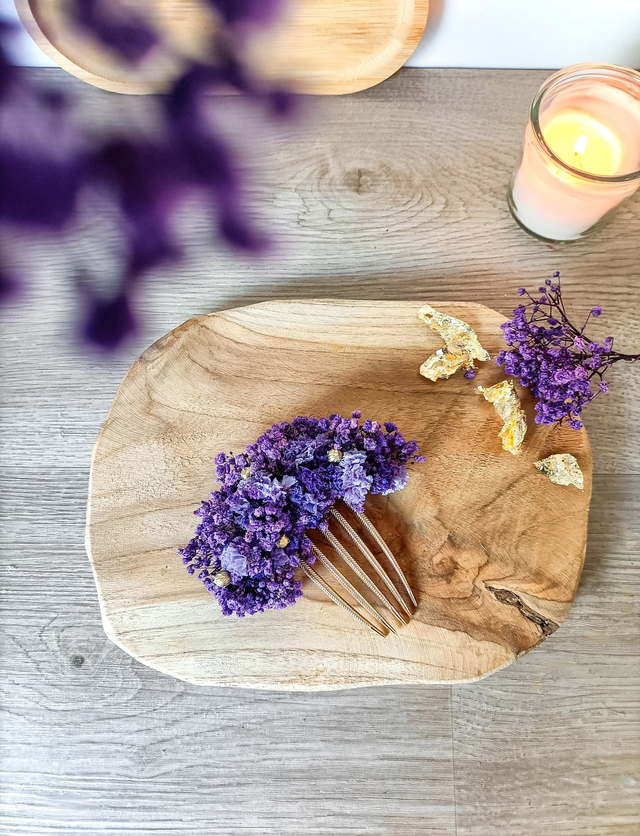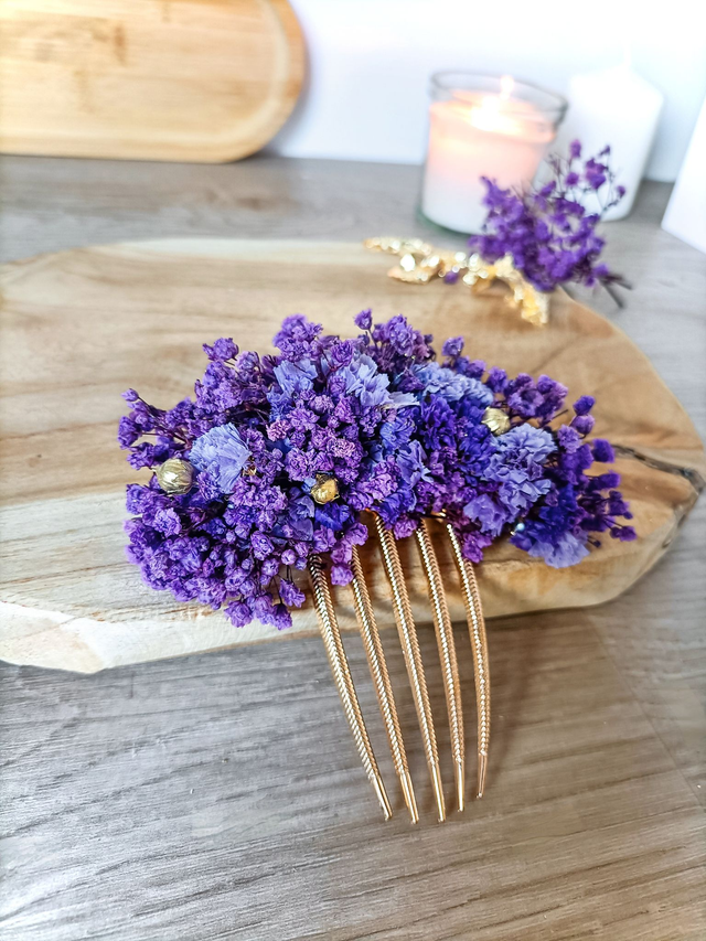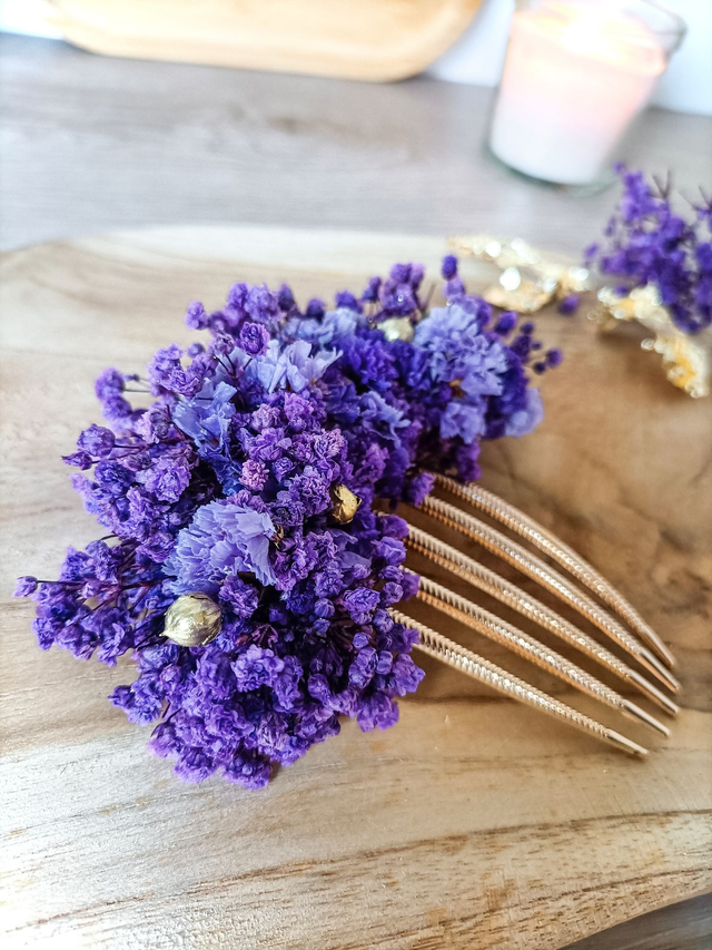- Composition: Gypsophile violet profond stabilisé et lin doré - Peigne en métal doré