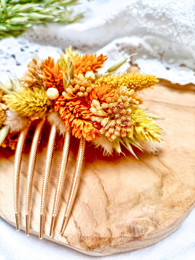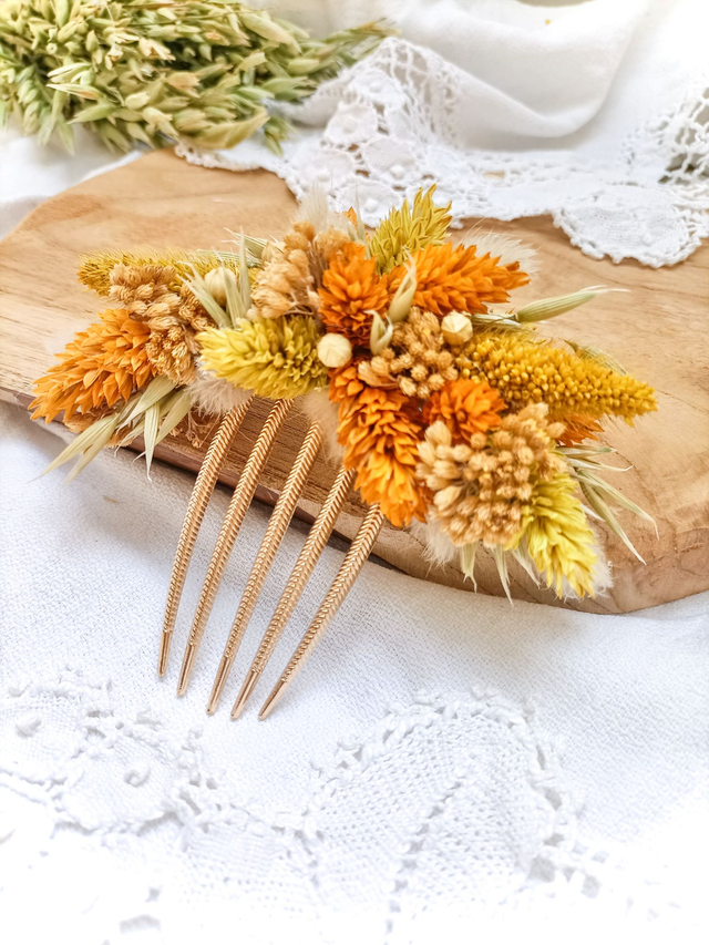 • Composition: Phalaris, lin, lagurus et avoine vert et achillée sont délicatement fixés sur un peigne en métal doré