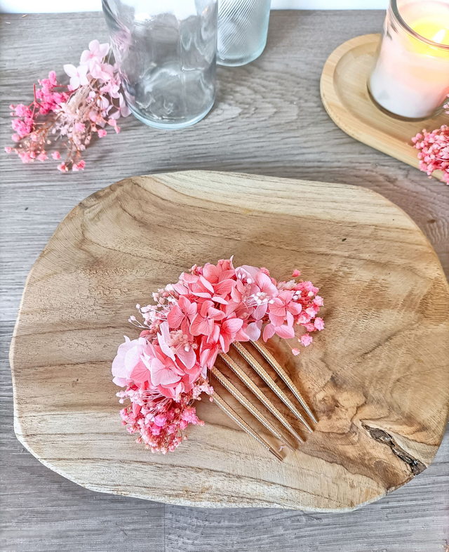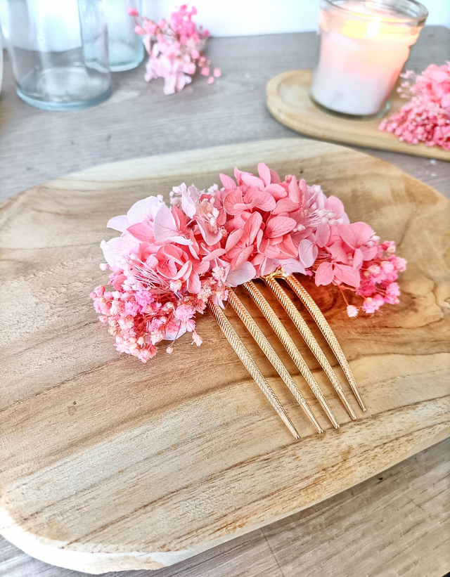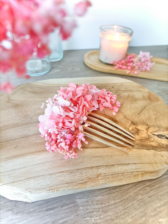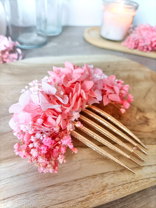 • Composition : Hortensia, broom, gypsophile stabilisés sont délicatement fixés sur un peigne en métal doré