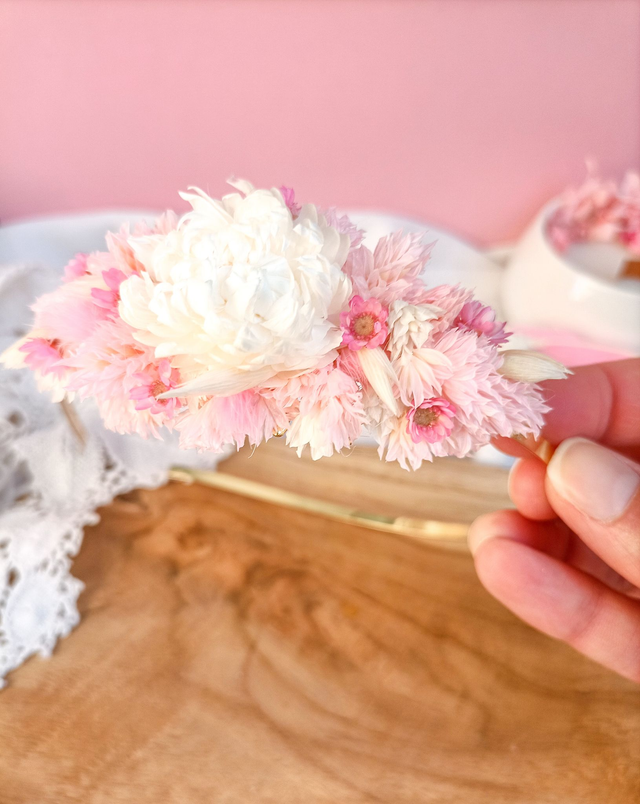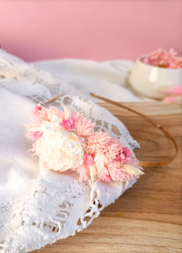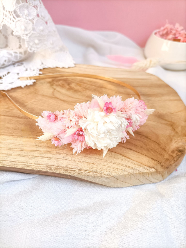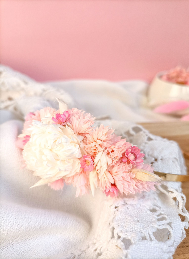 Une création délicate où la douceur des pétales roses, blancs et naturels vous apporte une allure à la fois raffinée et précieuse. Parfait pour sublimer vos cheveux virevoltants au vent, une tresse ou une demi-attache, ce serre-tête fleuri sublimera votre mise en beauté.