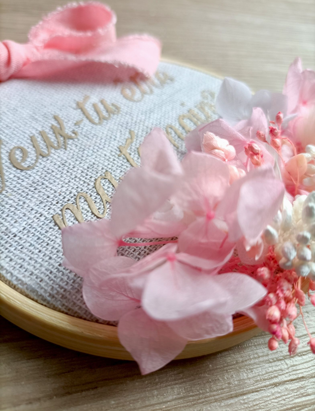 - Composition: Hortensia, lagurus, millet, ruscus, mini gypsophile- Cercle à broder de 10cm.. Ecriture dorée" Veux-tu être ma témoin?" - Nœud rose.